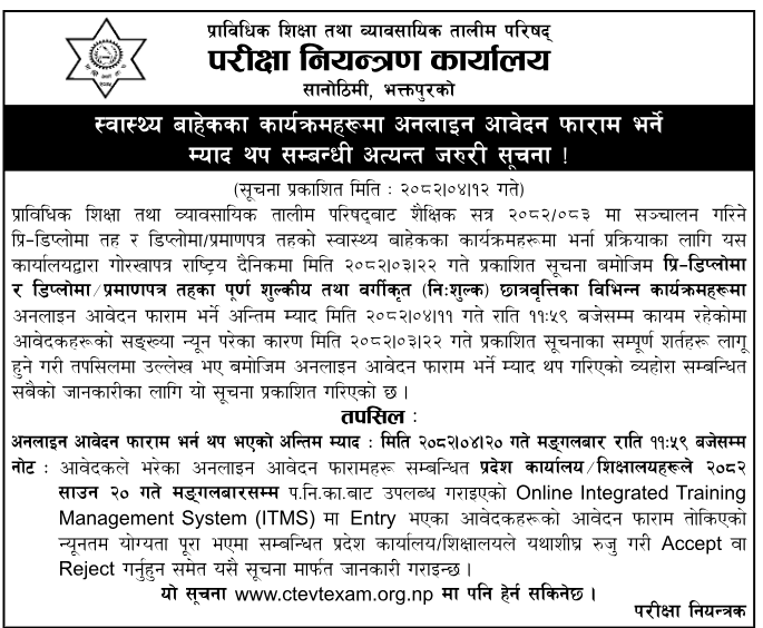 Following the notice published on 2082/03/22 regarding the admission process for diploma/certificate level programs (excluding health sciences), CTEVT has extended the deadline for submitting online application forms for various programs under scholarships for diploma/certificate levels, as mentioned in the details below, with all the terms and conditions of the notice published on 2082/03/22 remaining applicable.