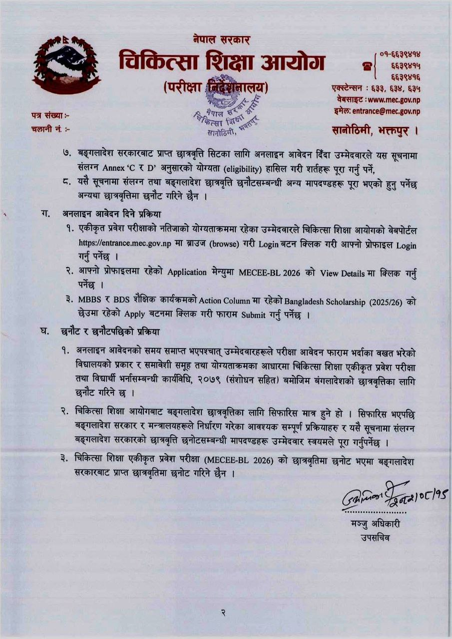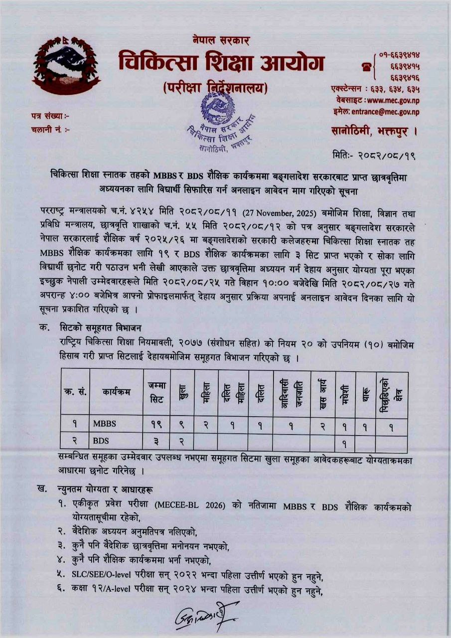 The Medical Education Commission (MEC), Examination Directorate, has issued a formal notice inviting applications from eligible Nepali students to utilize scholarship seats allocated for the MBBS and BDS academic programs by the Government of Bangladesh.