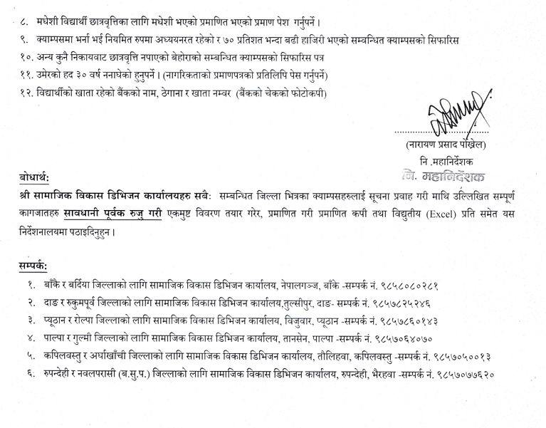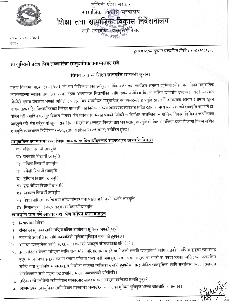 Ministry of Social Development, Directorate of Education and Social Development, Lumbini Province has announced that notice has been published to inform that scholarships aimed at financially disadvantaged students studying at the Bachelor's and Master's levels in community campuses within Lumbini Province will be provided.