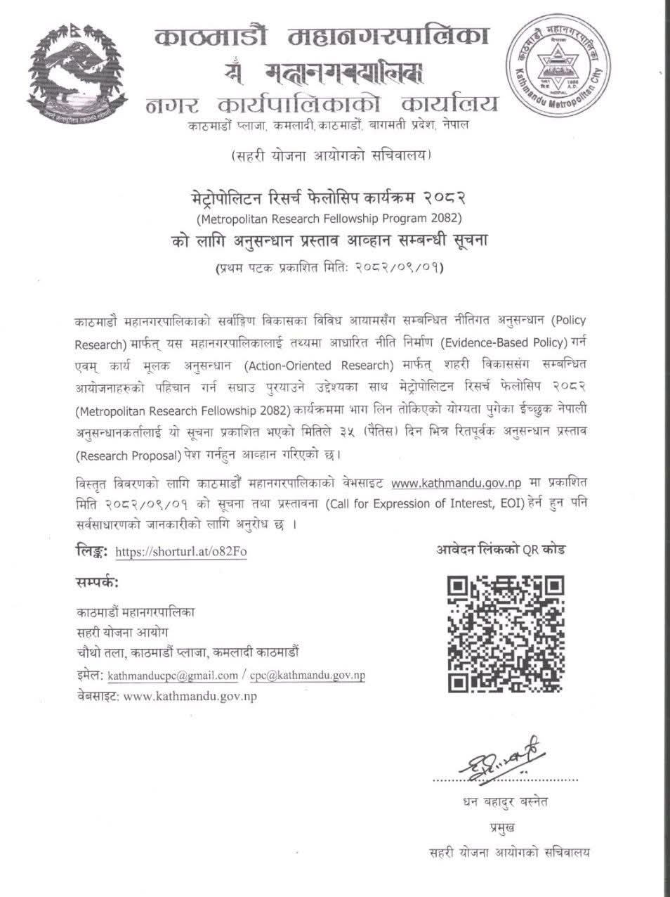 The Kathmandu Metropolitan City (KMC), in partnership with the Urban Planning Commission, has opened applications for its "Metropolitan Research Fellowship Program 2082," inviting Nepali researchers to contribute to the city's future urban development and policy-making.