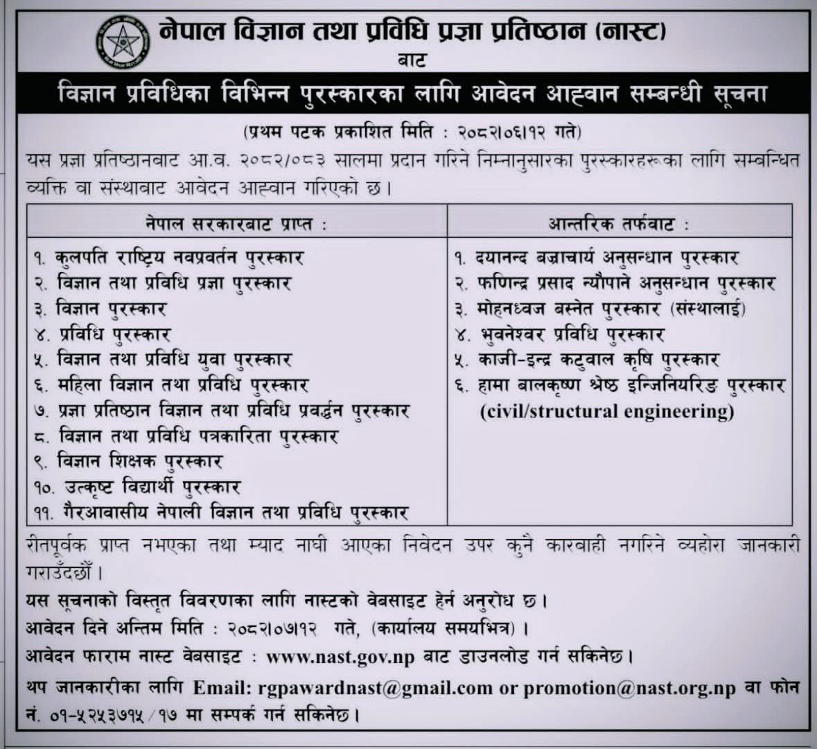 The Nepal Academy of Science and Technology (NAST), located in Khumaltar, Lalitpur, is pleased to announce the opening of applications for various awards for the fiscal year 2082/083.