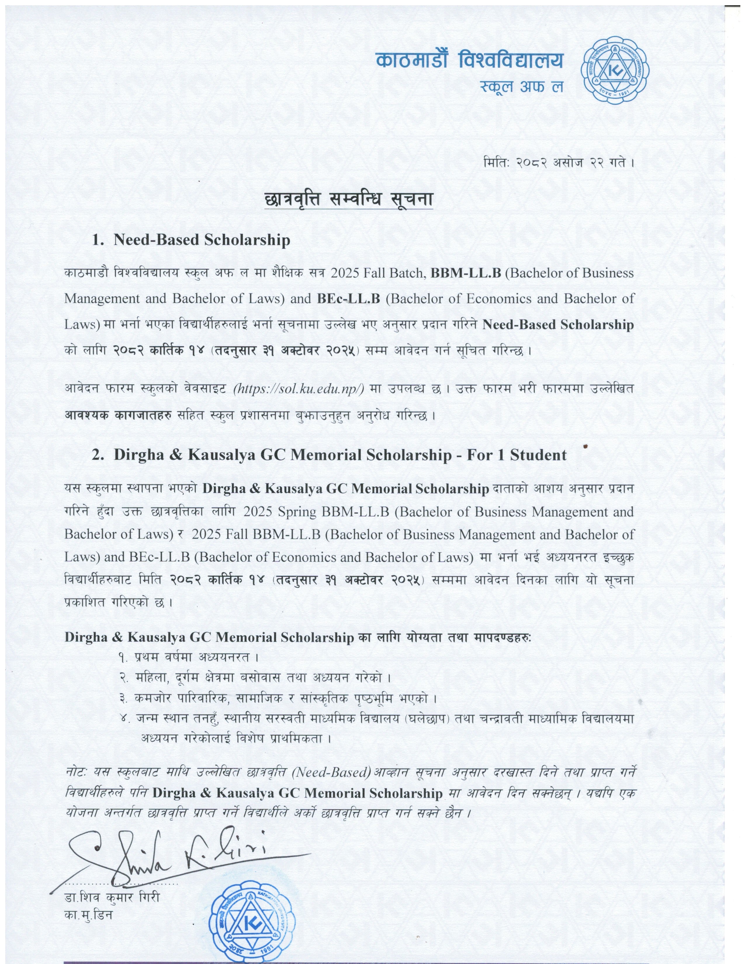 Kathmandu University School of Law has opened applications for its need-based scholarship program and the prestigious Dirgha & Kausalya GC Memorial Scholarship, designated for one student from the 2025 Fall Batch in the Bachelor of Business Management and Bachelor of Laws (BBM-LLB) and Bachelor of Economics and Bachelor of Laws (BEc-LLB) programs.