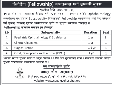 Nepal Eye Hospital, Kathmandu, has published a notice to inform all concerned regarding the ongoing admissions for the following subspecialty fellowship programs under Ophthalmology for the academic year 2082/83.