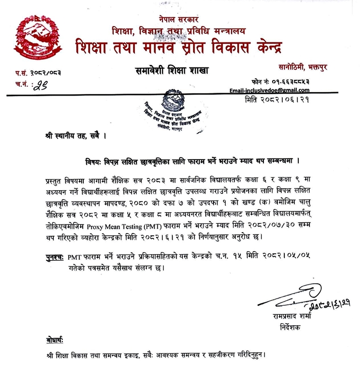 The Center for Education and Human Resource Development (CEHRD), Inclusive Education Branch, has extended the form fill-up deadline until Kartik 30, 2082 (November 16, 2025), for students to study in Grade 6 and 9 under the Pro-Poor Targeted Scholarship (PPTS) in the upcoming academic year 2083.