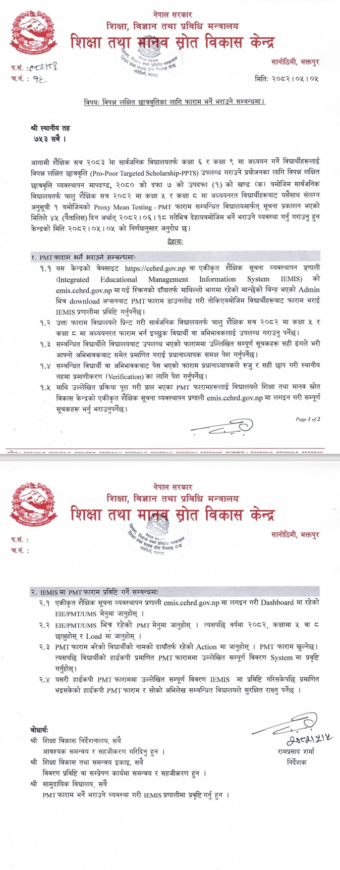 Earlier, the CEHRD announced the deadline to submit the form on Ashoj 16, 2082. PPTS scholarships will be provided to students of the current academic year 2082 who are studying in Grade 5 and 8 in community schools for studying in Grade 6 and 9 in the coming academic year 2083 in accordance with Section 7, Subsection 1(a) of the Scholarship Management Guidelines, 2080. To facilitate this process, schools must fill out the Proxy Means Testing (PMT) Form as specified in Schedule 1 of the guidelines.