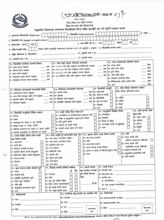 - Schools must log in to the IEMIS system (https://emis.cehrd.gov.np) and enter all required information from the completed PMT forms.