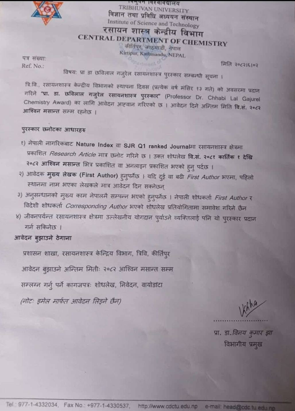 Central Department of Chemistry, Tribhuvan University, Kirtipur has opened an application for the 'Professor Dr. Chhabi Lal Gajurel Chemistry Award' . Professor Dr. Chhabi Lal Gajurel Chemistry award is conferred on the establishment day of the Central Department of Chemistry, Tribhuvan University.