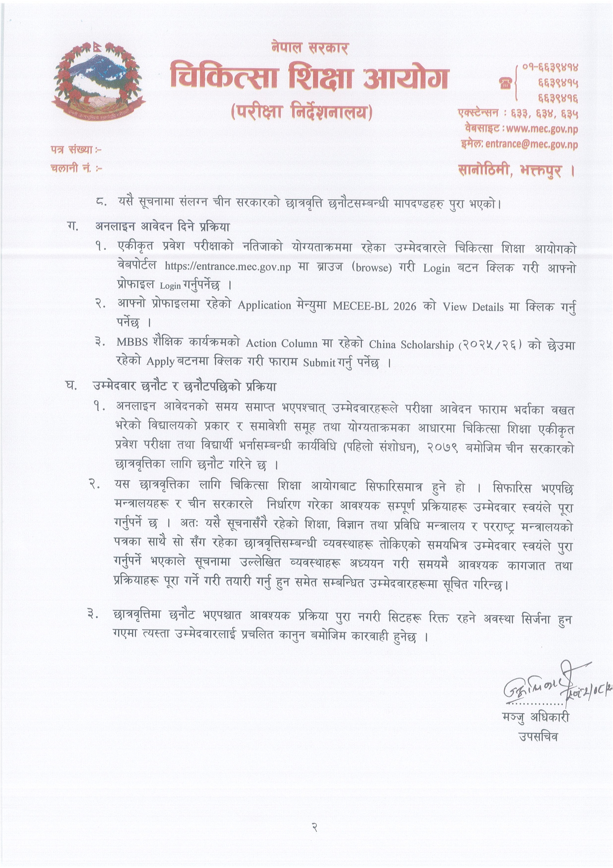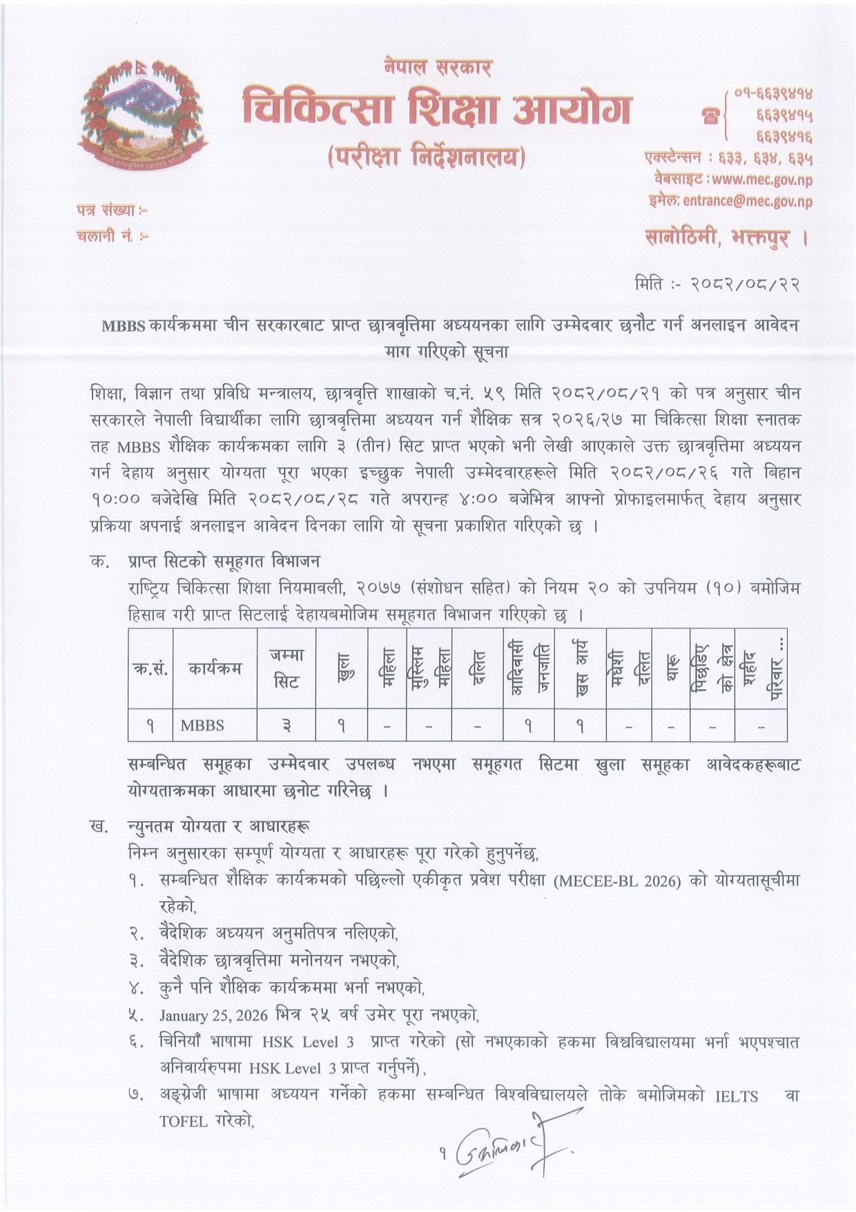 The Medical Education Commission (MEC), Examination Directorate, has invited online applications from eligible Nepali students for MBBS scholarships provided by the Chinese Government for the academic session 2026/27. The Ministry of Education, Science, and Technology has allocated three seats for the MBBS program under this scholarship scheme.