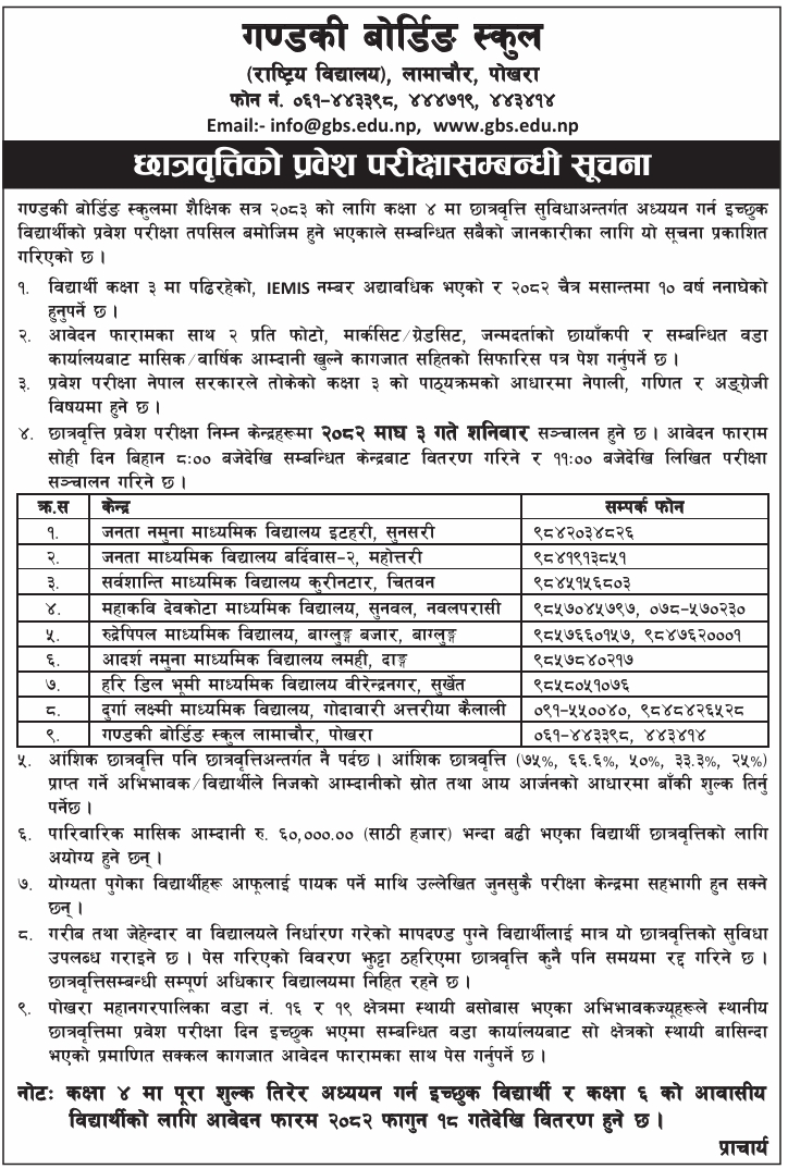 Gandaki Boarding School, located in Lamachaur, Pokhara, has published a notice for the information regarding the entrance examination for students wishing to study under the scholarship scheme in Class 4 for the Academic Session 2083. The entrance examination will be held according to the following details: