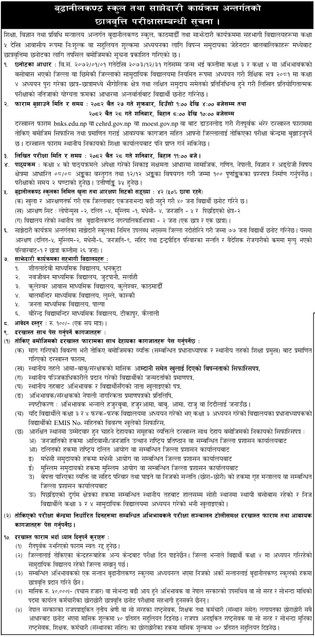 - Children of parents/guardians with a monthly income of Rs. 50,000/- (Fifty Thousand) or more, or children of Nepal Government Undersecretaries or equivalent and higher-ranking employees, are not eligible to participate in the scholarship selection examination.