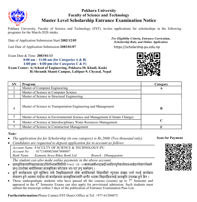 Pokhara University, Faculty of Science and Technology (FST), invites applications for scholarships in the following programs for the March- 2026 intake: