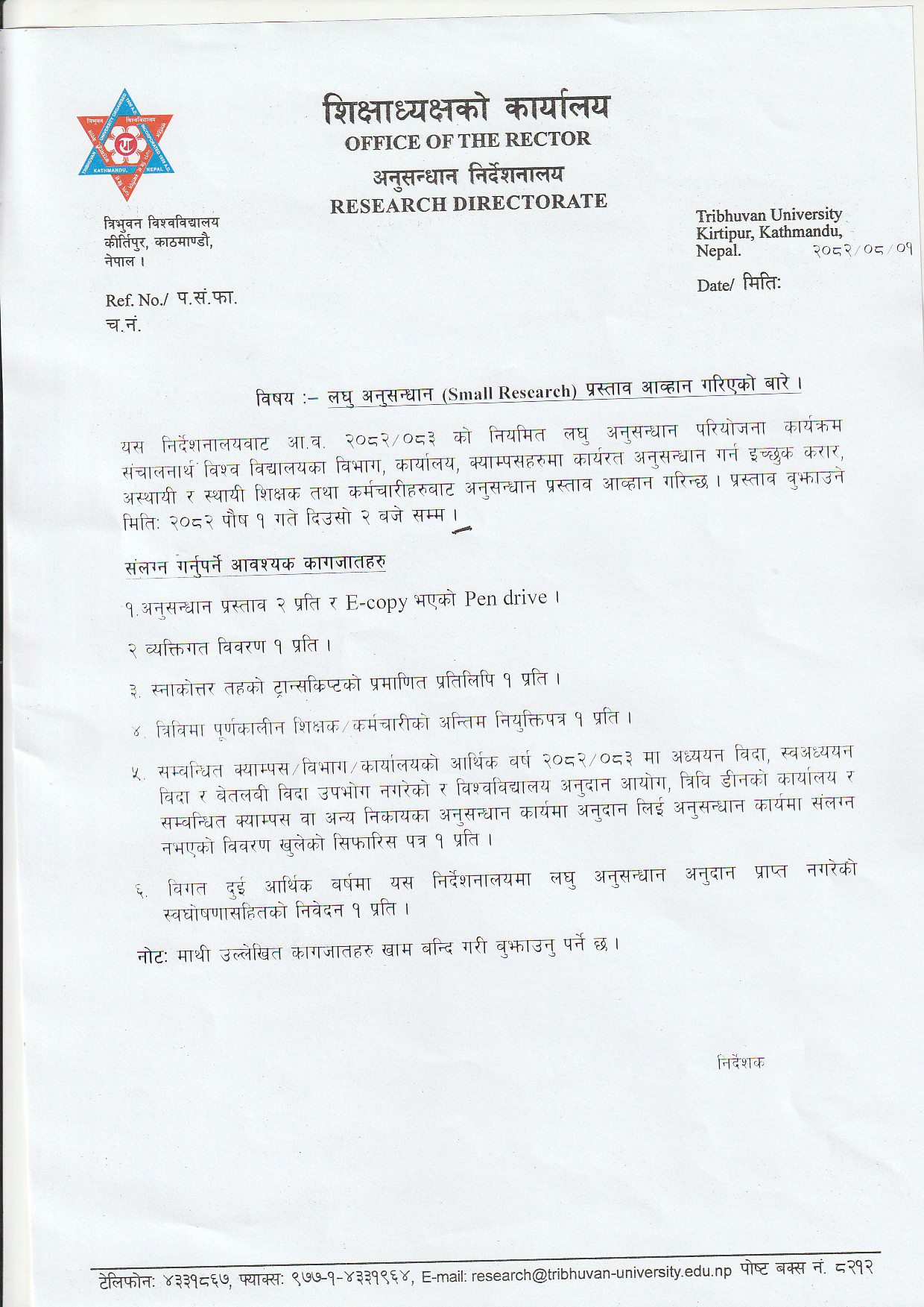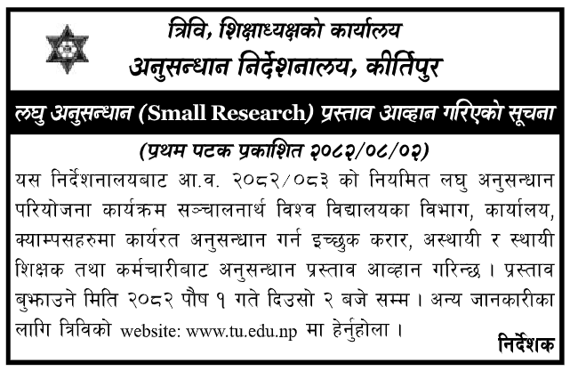 Tribhuvan University (TU), Office of the Rector, Research Directorate, Kirtipur invites research proposals from contractual, temporary, and permanent teachers and staff working in the University's departments, offices, and campuses who are interested in conducting research, for the operation of the regular Small Research Project Program for the fiscal year 2082/083.