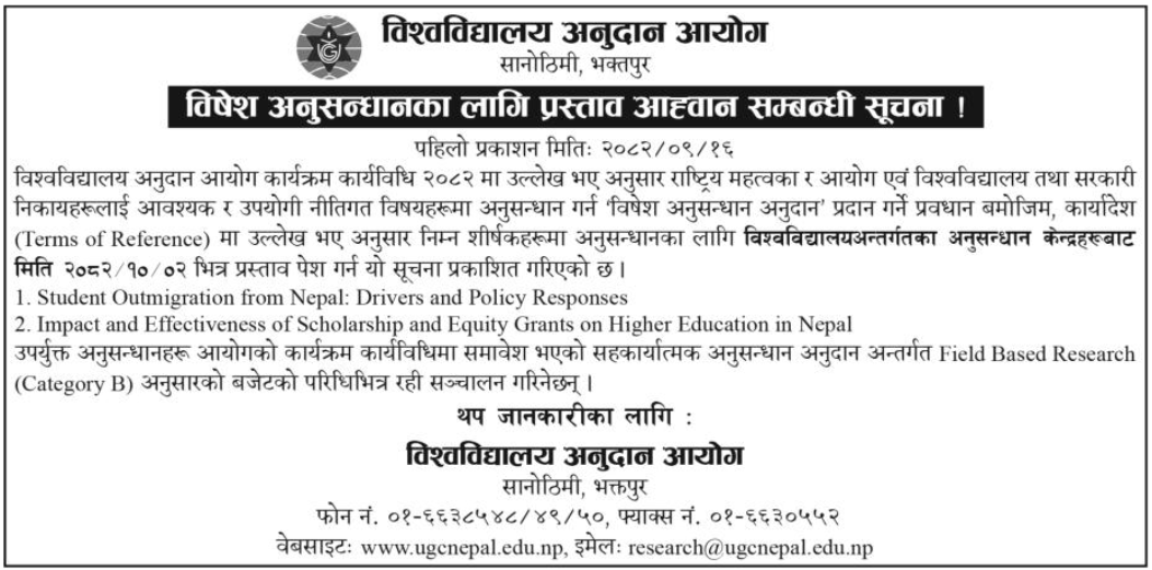 The University Grants Commission has published a notice as per the provisions mentioned in the University Grants Commission Program Procedure 2082 to provide 'Special Research Grants' for researching subjects of national importance and policy-related matters necessary and useful for the Commission, universities, and government bodies. This notice is for Research Centers under Universities to submit proposals for research on the following titles as specified in the Terms of Reference (ToR) by the deadline of 2082/10/02.