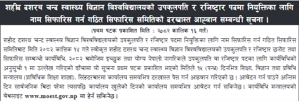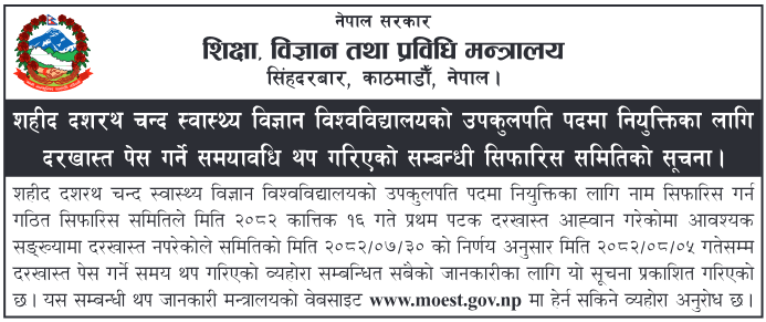 The Ministry of Education, Science and Technology has published a notice regarding the extension of the deadline for the position of Vice-Chancellor of Shaheed Dasharath Chand University of Health Sciences, as the required number of applications was not received. The deadline for submitting applications has been extended until Mangsir 5, 2082, as per the Committee's decision dated Kartik 30, 2082.