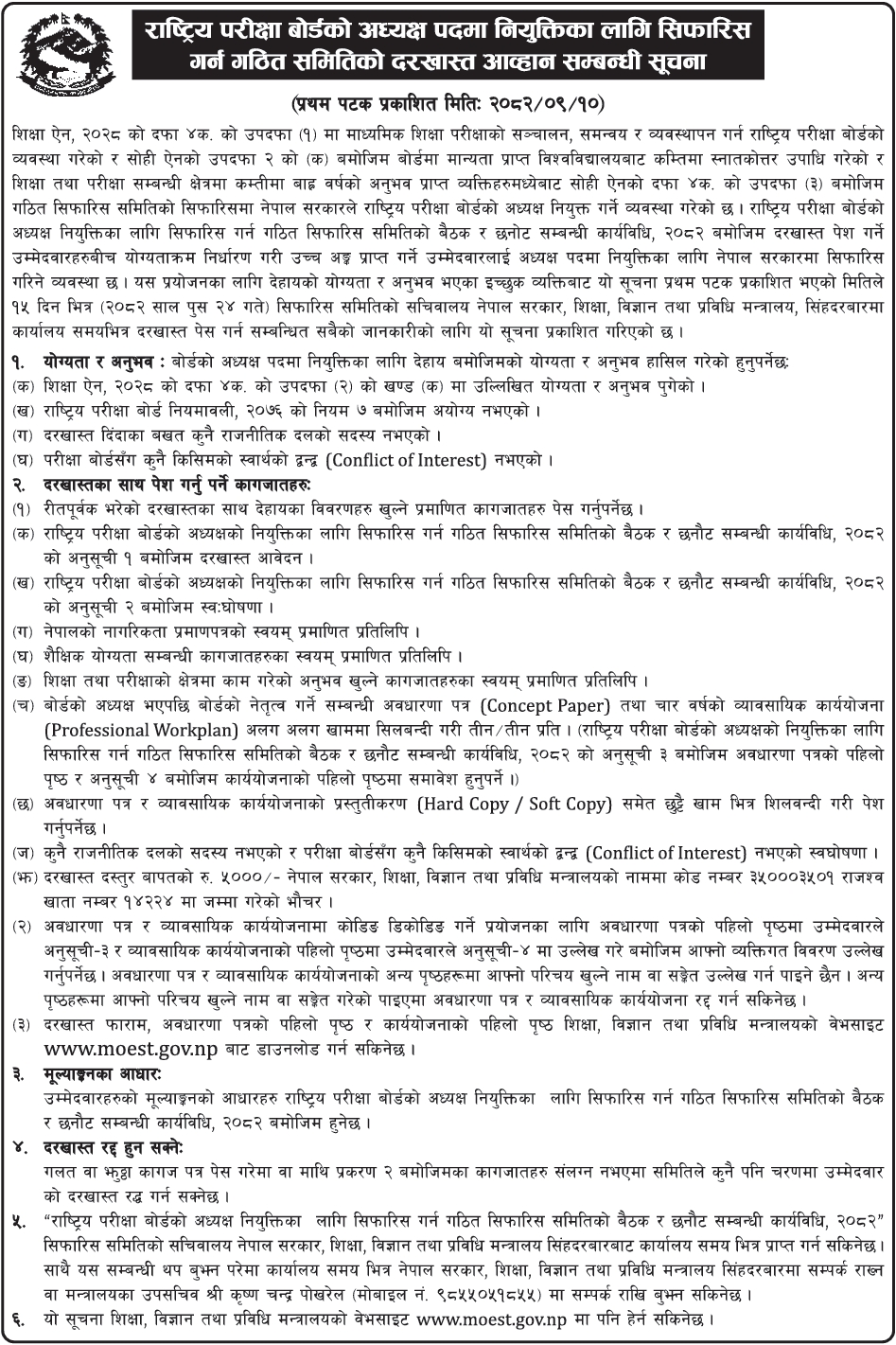 In accordance with the "Procedure for Meetings and Selection of the Recommendation Committee Formed for the Appointment of the Chairperson of the National Examination Board, 2082," candidates who achieve the highest scores based on merit will be recommended to the Nepal Government for appointment. For this purpose, interested individuals possessing the following qualifications and experience are invited to submit their applications within 15 days from the date of first publication of this notice during office hours at the Secretariat of the Recommendation Committee, Ministry of Education, Science and Technology, Government of Nepal, Singha Durbar.