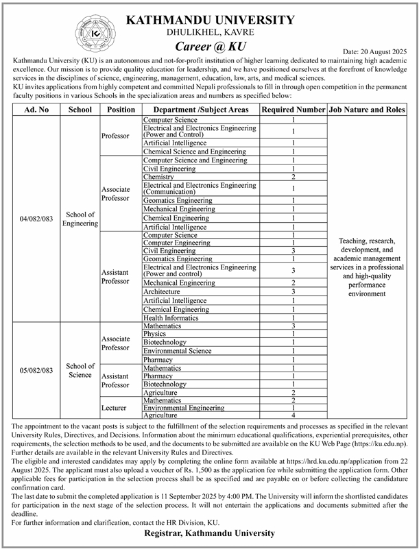 KU invites applications from highly competent and committed Nepali professionals to fill permanent faculty positions in the School of Engineering and School of Science, specializing in the areas and numbers specified below, through an open competition. The nature of the job encompasses teaching, research, development, and academic management roles in a professional and high-quality performance environment.