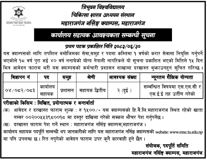 Note: Detailed information regarding the Office Assistant post is also available on the website of Maharajgunj Nursing Campus: www.mnc.tu.edu.np. No action will be taken on incomplete applications.