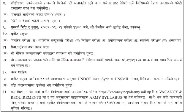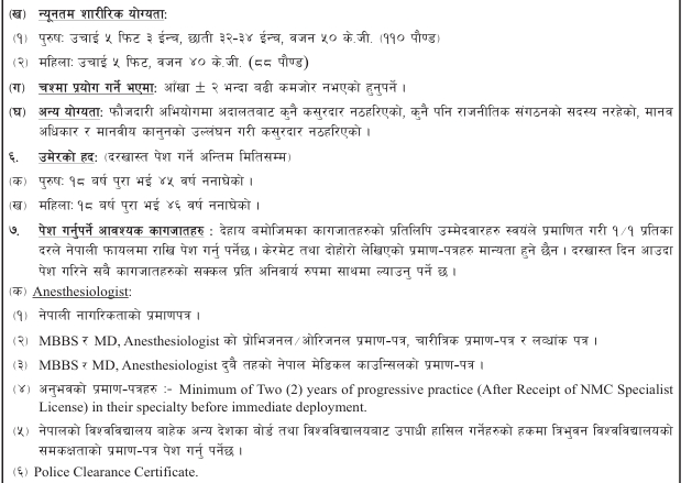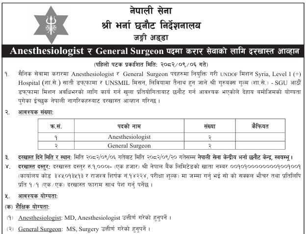 The Nepal Army invites applications from qualified, experienced Nepali citizens for contract-based appointments to the posts of Anesthesiologist and a General Surgeon. Selected candidates will be deployed under the UNDOF Mission, Syria (Level 1+ Hospital β Armed Forces) and UNSMIL Mission, Libya (Medical Team β Armed Forces) / SGU.