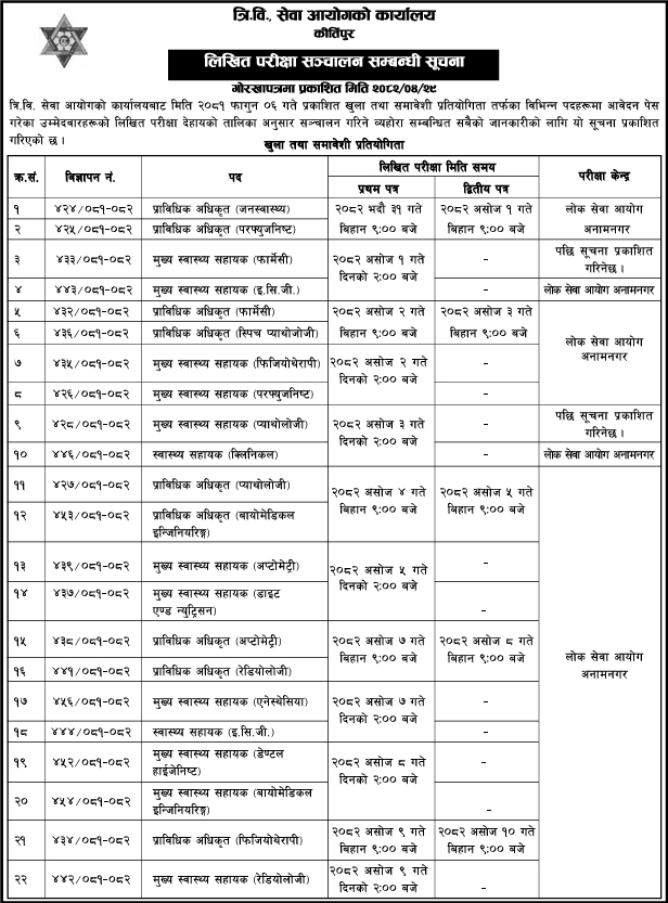 Tribhuvan University Service Commission Office, Kirtipur, has announced the written examination schedule for candidates who have applied for various open and inclusive positions according to the vacancy notice published on 2081/11/06.