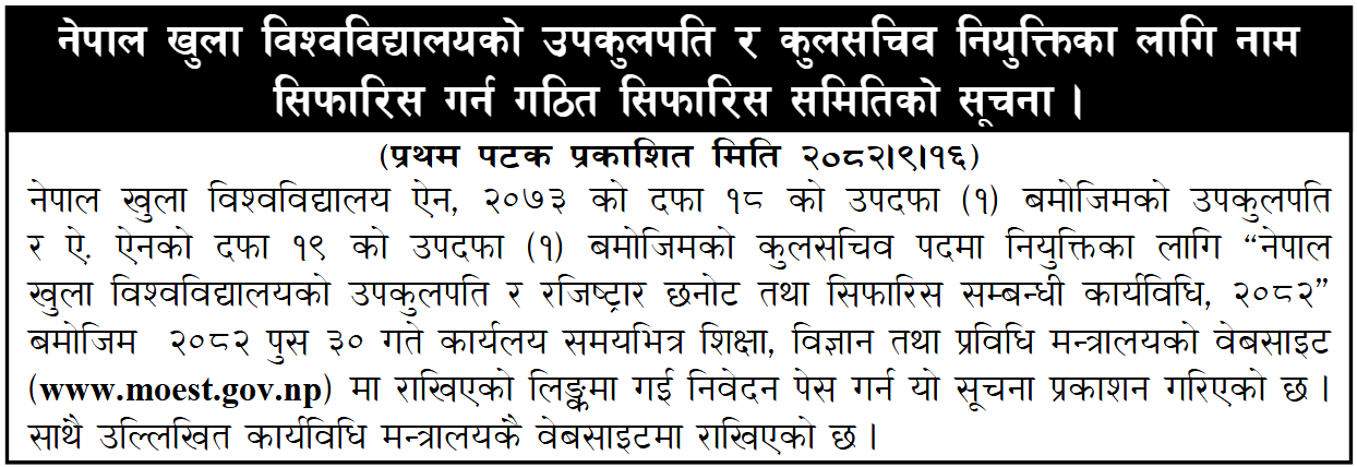 Qualified candidates are requested to apply via the link provided on the website of the Ministry of Education, Science and Technology (www.moest.gov.np) by Poush 30, 2082, within office hours, as per the "Procedure Related to the Selection and Recommendation of Vice-Chancellor and Registrar of Nepal Open University, 2082."