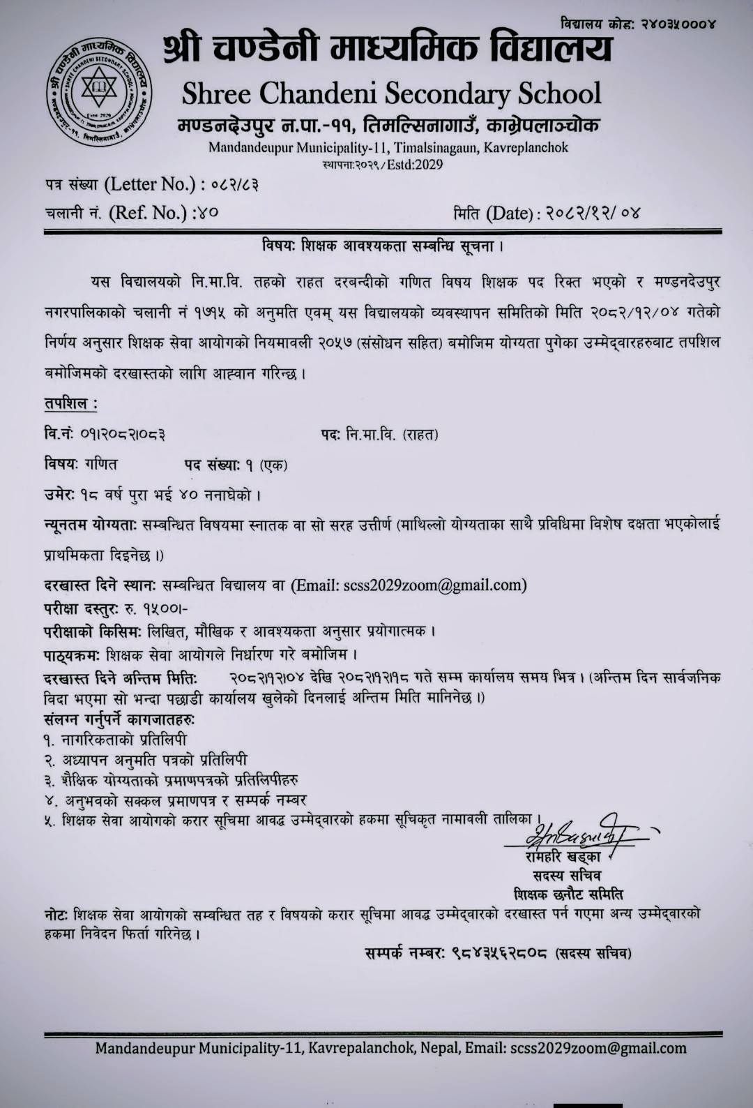 Shree Chandeni Secondary School, located in Mandandeur Municipality-11, Timalsinagaun, Kavrepalanchok, invites applications from qualified Nepali citizens for a teaching position at the lower secondary level (Ni.Ma.Vi.) relief post. This recruitment is conducted by Shree Chandeni Secondary School, with approval from Mandandeur Municipality and the decision of the School Management Committee dated 2082/12/04, in accordance with the Teacher Service Commission Regulations 2057 (with amendments).