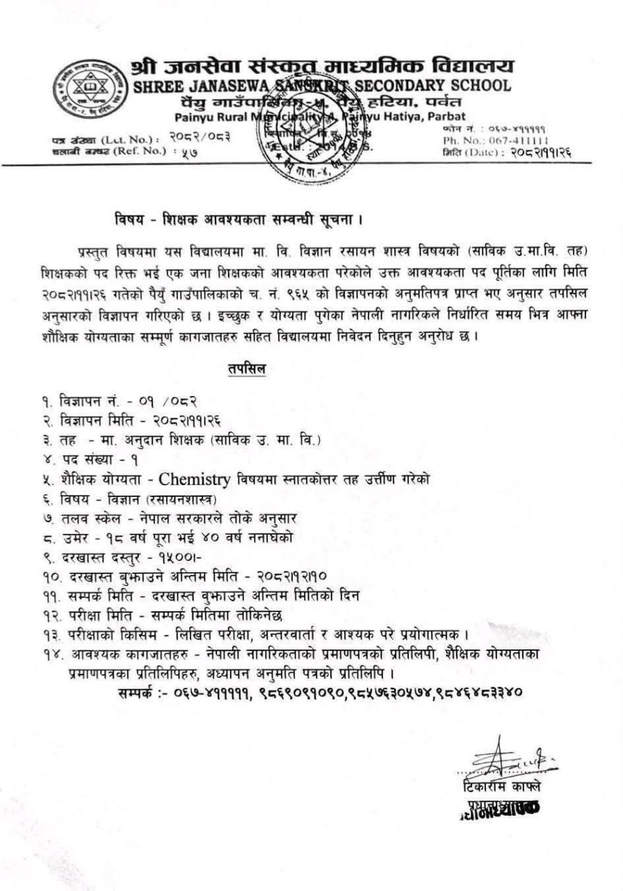 Shree Janasewa Sanskrit Secondary School, located in Painyu Rural Municipality, Painyu Hatiya, Parbat, invites applications from qualified Nepali citizens for a grant-aided secondary-level (Ma. Vi.) teaching position. This recruitment is conducted by Shree Janasewa Sanskrit Secondary School with approval from Paiyun Rural Municipality.