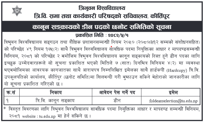 The Secretariat of the Tribhuvan University Assembly and Executive Council, Kirtipur, has announced a vacancy for the position of Dean at the Faculty of Law of Tribhuvan University, as per Chapter 49 Rule 175(2) of the Tribhuvan University Organization and Academic Administration Rules 2050 (with amendments up to 2080/3/12) and in accordance with Chapter 2 of the Regulations on the Basis and Criteria for Appointment to Fixed-Term Posts of Tribhuvan University, 2081.