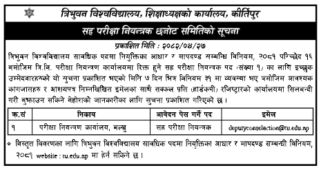 Tribhuvan University, Office of the Rector, has announced a vacancy for the position of Deputy Controller of Examinations in the Office of the Controller of Examinations under the university as per Chapter 16 of the Regulations on the Basis and Criteria for Appointment to Fixed-Term Posts of Tribhuvan University, 2081.