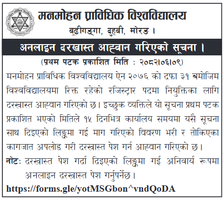 Manmohan Technical University, Budhiganga, Morang, invites applications for the appointment to the vacant post of Registrar at the university, as per Section 31 of the Manmohan Technical University Act, 2076. Interested individuals are requested to fill in the details and upload the required documents as specified in the link provided with this notice and submit their application within 15 days from the date of its first publication during office hours.