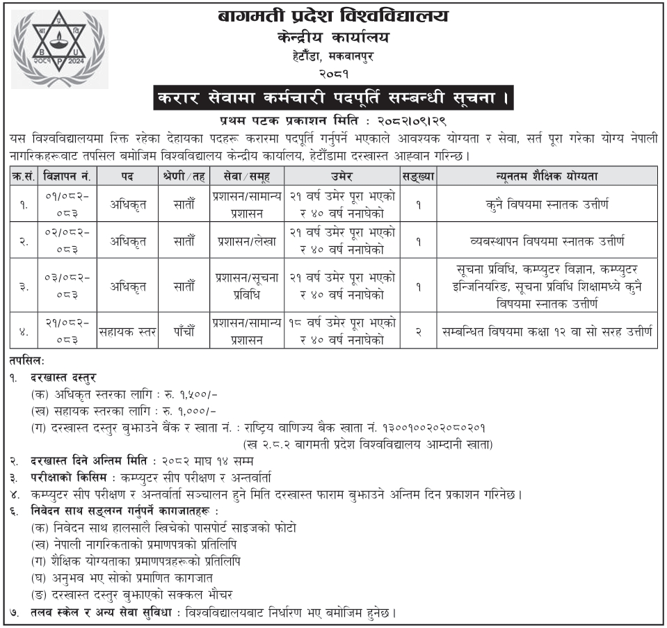 Bagmati University, Central Office, Hetauda, has invited applications from eligible Nepali citizens who have met the necessary qualifications, terms, and conditions to fulfill the following vacant positions in this university on a contract basis.