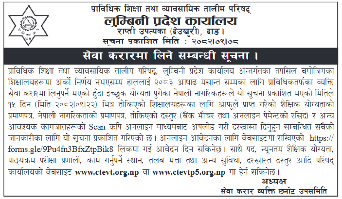 The Council for Technical Education and Vocational Training, Lumbini Province, has published a notice regarding vacancies on a service contract for technical training positions for schools under the CTEVT Lumbini Province Office. Interested Nepali citizens who meet the qualifications are requested to submit their application forms along with scanned copies of the following documents through the online medium for the specified schools: Educational Qualification certificates, nepali citizenship certificate, prescribed fee (bank voucher or online payment receipt), and other necessary documents within 15 (fifteen) days from the date of publication of this notice during office hours.